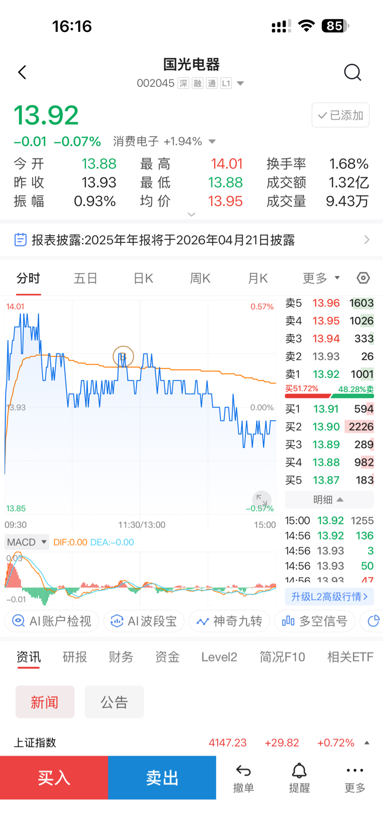 $国光电器(SZ002045)$ 真是恶心以为消费电子涨所以才买它,谁知道13.96买也被套了各位兄弟成本都多少啊#收盘点评# #炒股日记# #股市怎么看# #实盘记录#