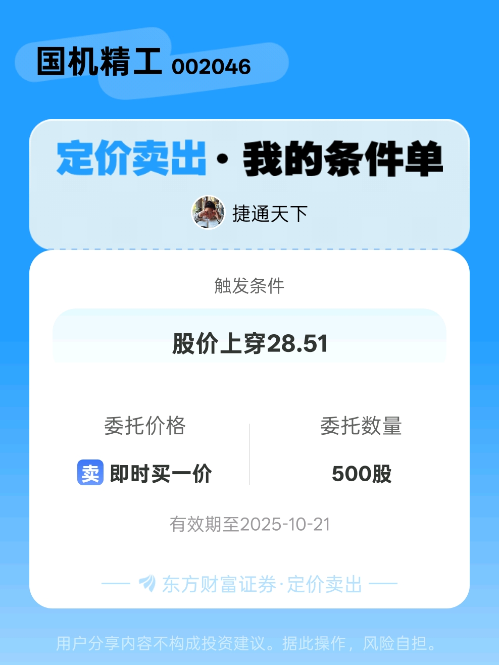 #条件单交流# #定价卖出晒单# 一位股神设置了一个定价卖出条件单,接下来就是见证奇迹的时刻~$国机精工(SZ002046)$
