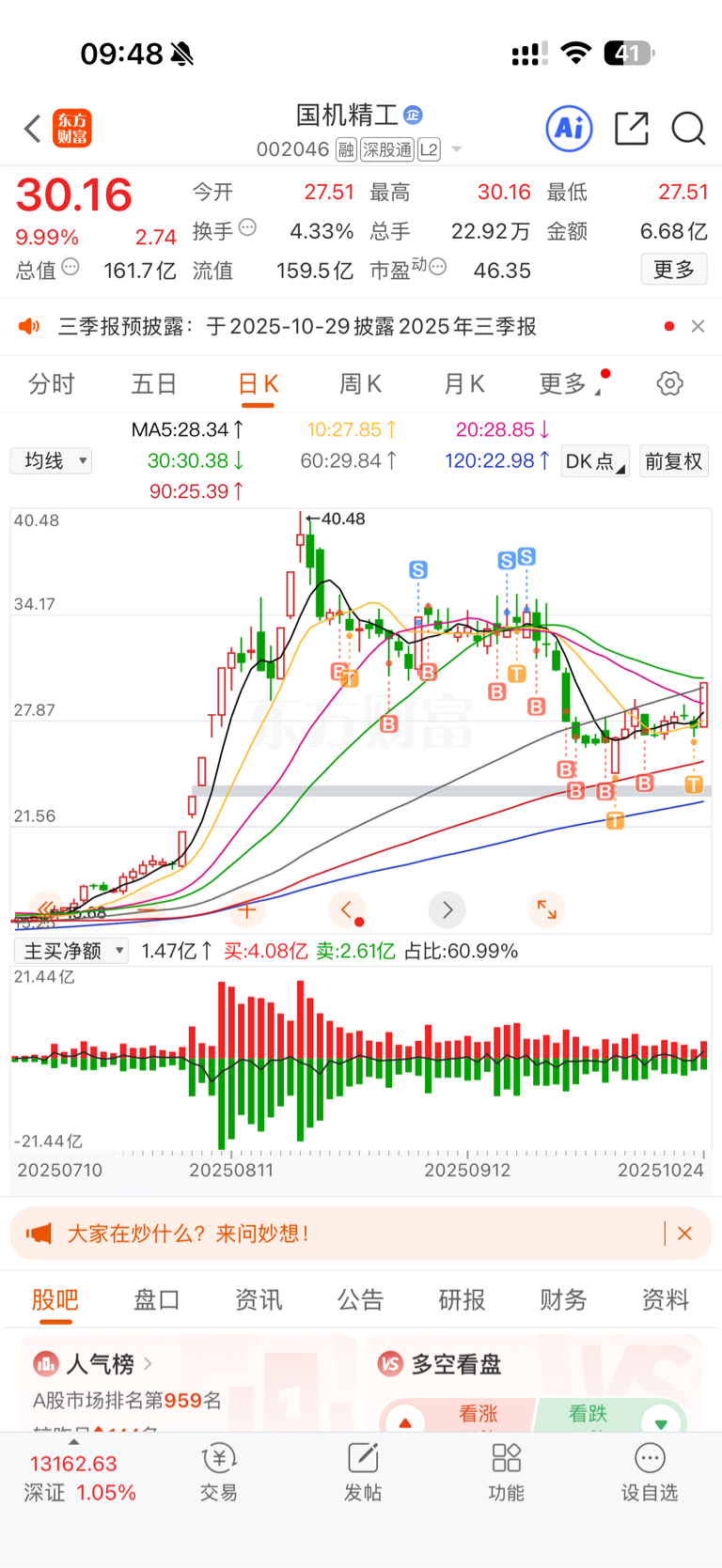$国机精工(SZ002046)$ 34的成本,一路跌一路加,成本降到28.5,煎熬一个多月可算起来了。