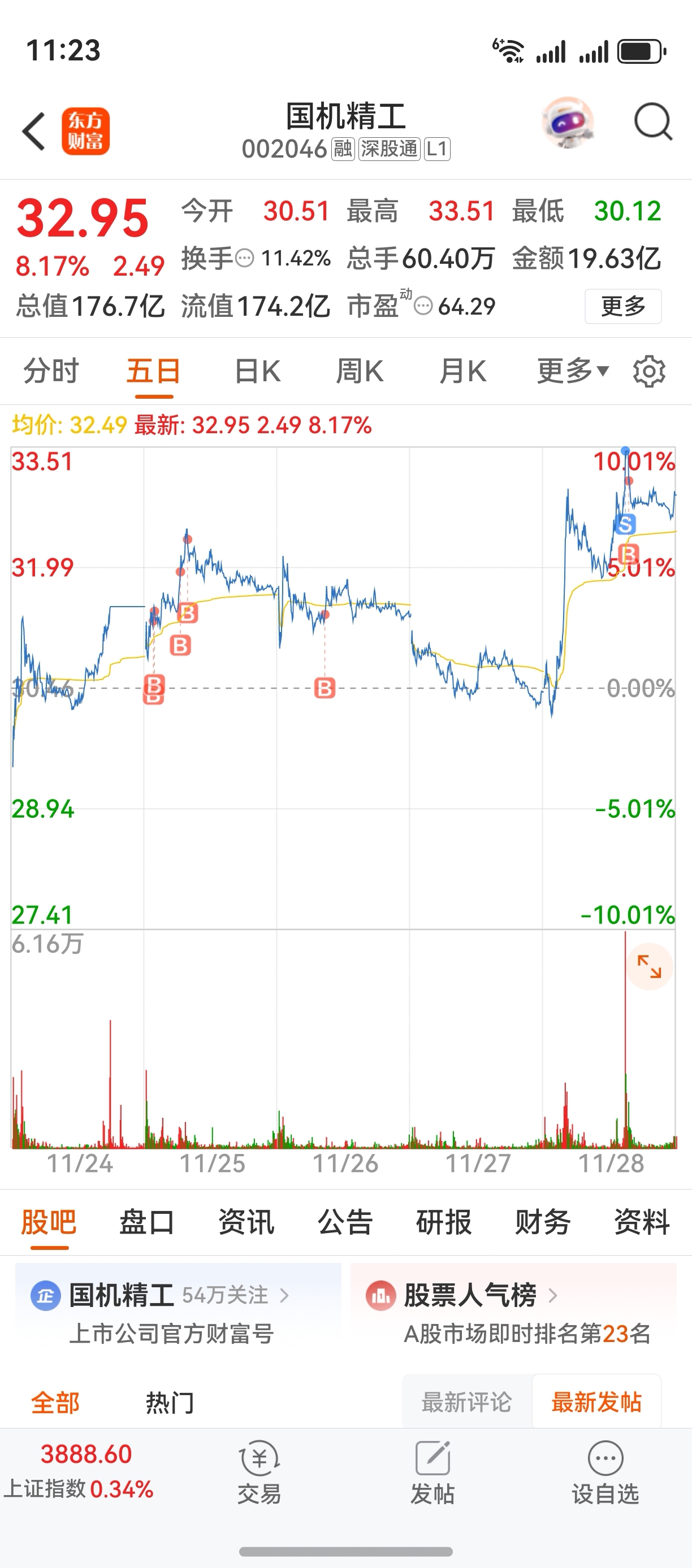 $国机精工(SZ002046)$ 上个板追高进来的,感谢主力。星期五涨停卖了,又进来半仓。