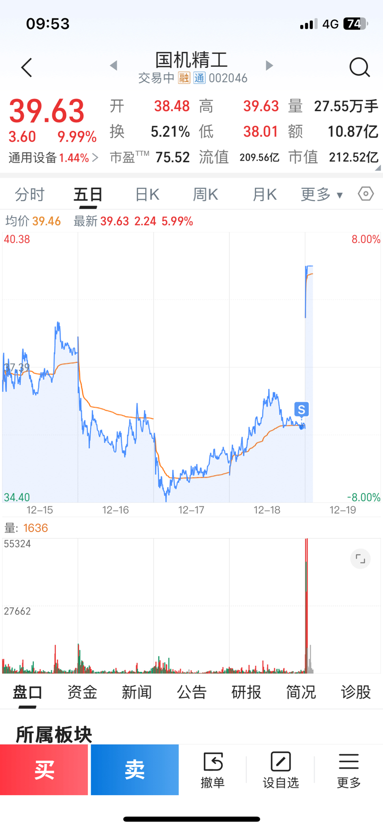 $国机精工(SZ002046)$ 拿了一个礼拜,昨天下午卖了,真是追着我来干,一卖就大涨,不是一次二次了,这种情况今年10月份以来第9次了,每次买的票拿了一两天觉得没情况就卖了,第二天就涨停,每次都是这样,算了算了,这个月过完销户
