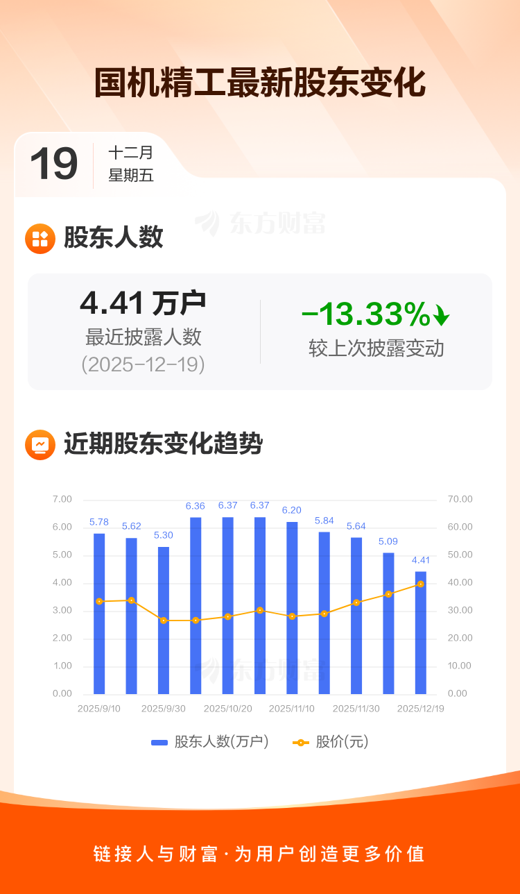 国机精工最新披露数据显示,截至12月19日公司股东户数为4.41万户,较上期(2025年12月10日)减少6782户,降幅为13.33%。户均持有流通股数量由上期的1.04万股上升至1.20万股,户均持股金额由上期的37.39万元增加至47.53万元。