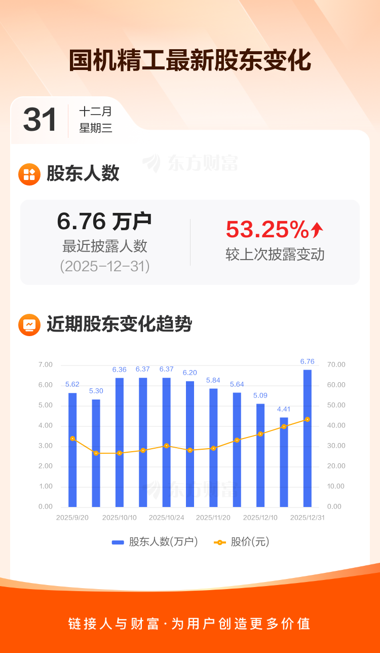 国机精工最新披露数据显示,截至12月31日公司股东户数为6.76万户,较上期(2025年12月19日)增加2.35万户,增幅为53.25%。户均持有流通股数量由上期的1.20万股下降至7826股,户均持股金额由上期的47.53万元减少至33.79万元。