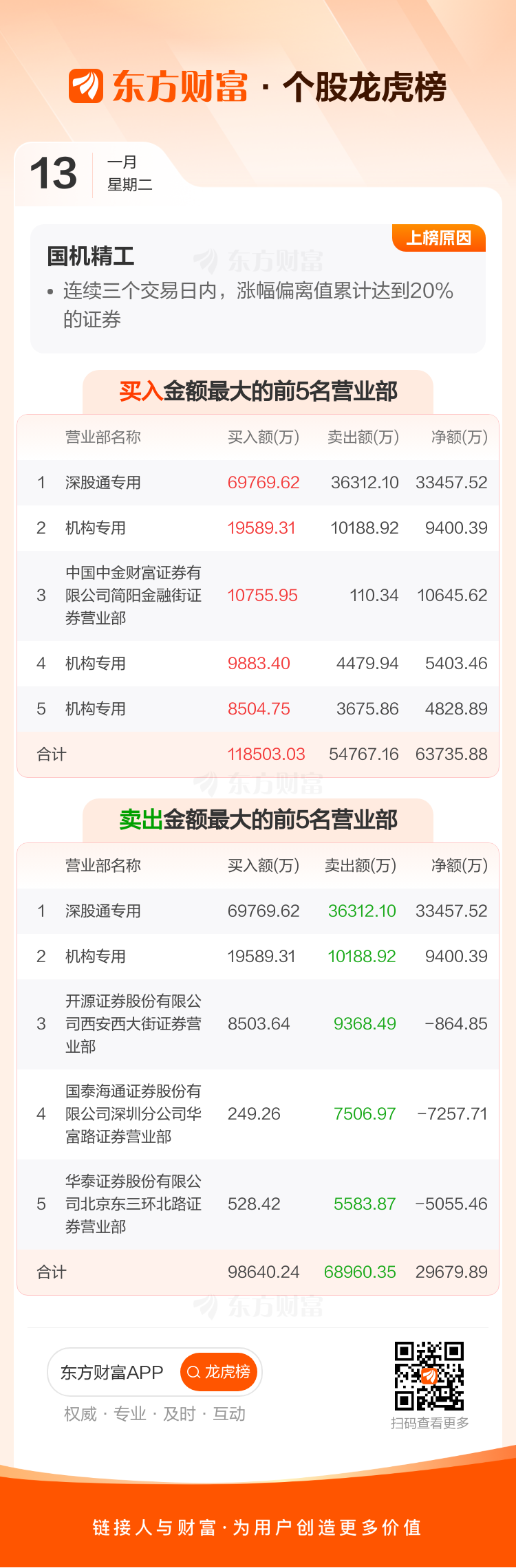 交易所2026年1月13日公布的交易公开信息显示,国机精工因成为连续三个交易日内,涨幅偏离值累计达到20%的证券上榜。国机精工当日收报51.77元,涨跌幅1.45%,换手率14.62%,成交额39.16亿。异常期间1月9日至1月13日,期间涨幅22.76%,累计偏离值20.82%,区间成交额78.25亿。
