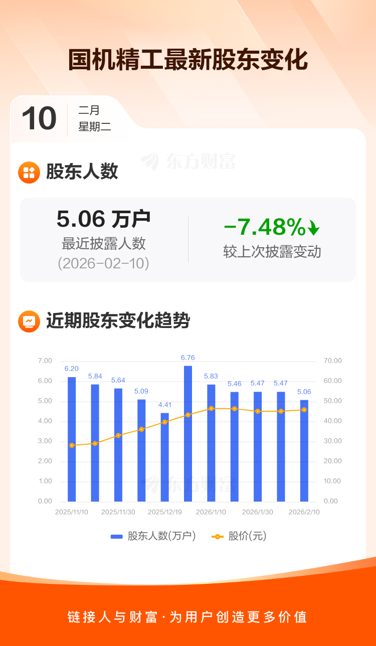 国机精工最新披露数据显示,截至2月10日公司股东户数为5.06万户,较上期(2026年1月31日)减少4091户,降幅为7.48%。户均持有流通股数量由上期的9674股上升至1.05万股,户均持股金额由上期的43.53万元增加至47.84万元。