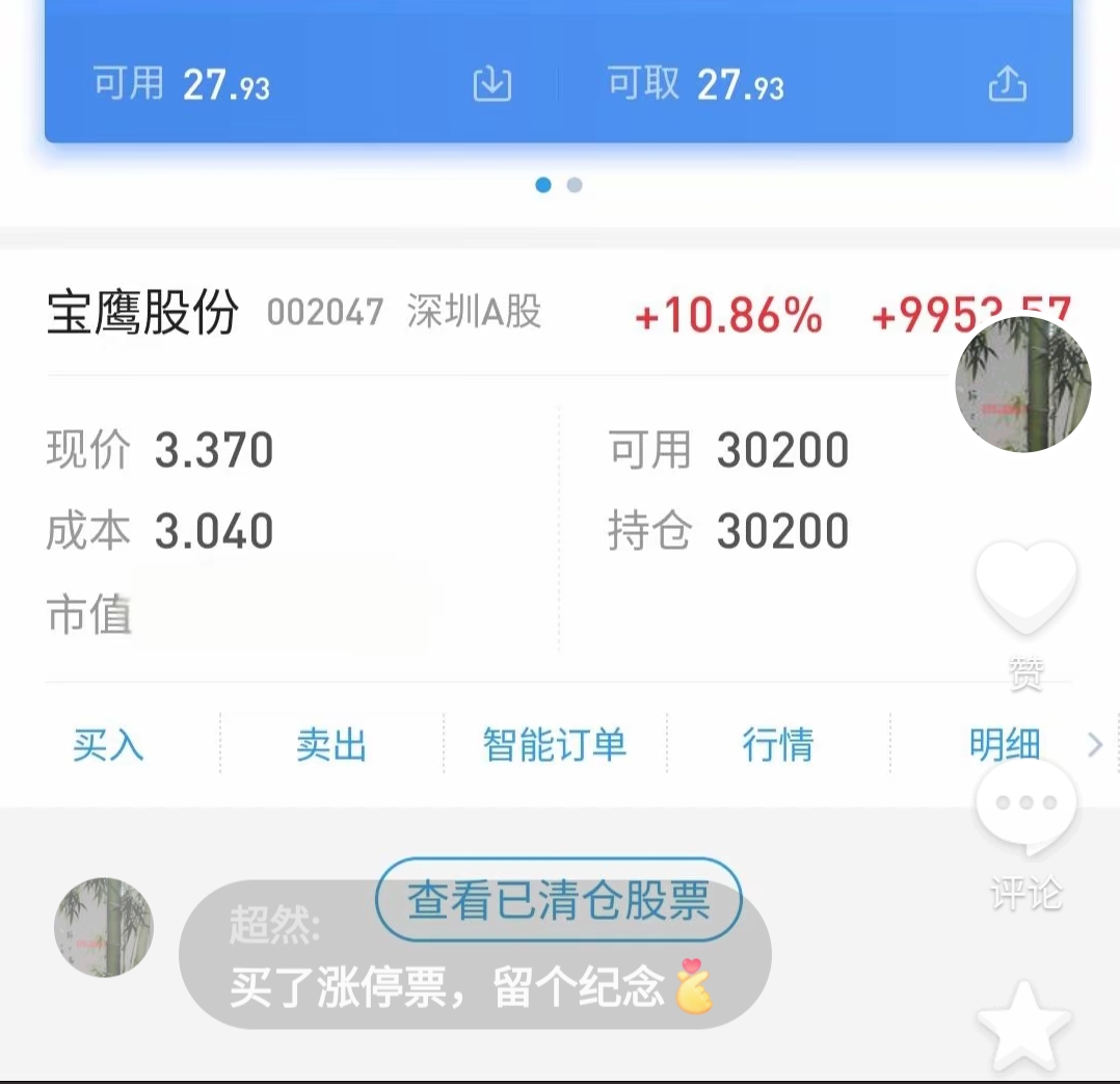 $宝鹰股份(SZ002047)$ 全段时间在宝鹰吃了个涨停,不管怎么样还是要说声谢谢。