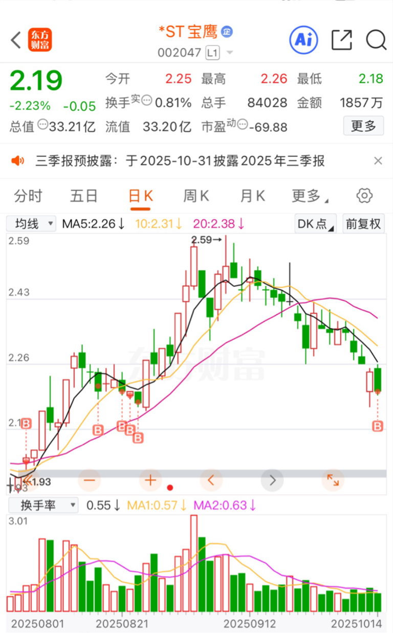 $*ST宝鹰(SZ002047)$ 鹰鹰又到了我此前建仓的区间了,今天尾盘2.19继续搞一点...