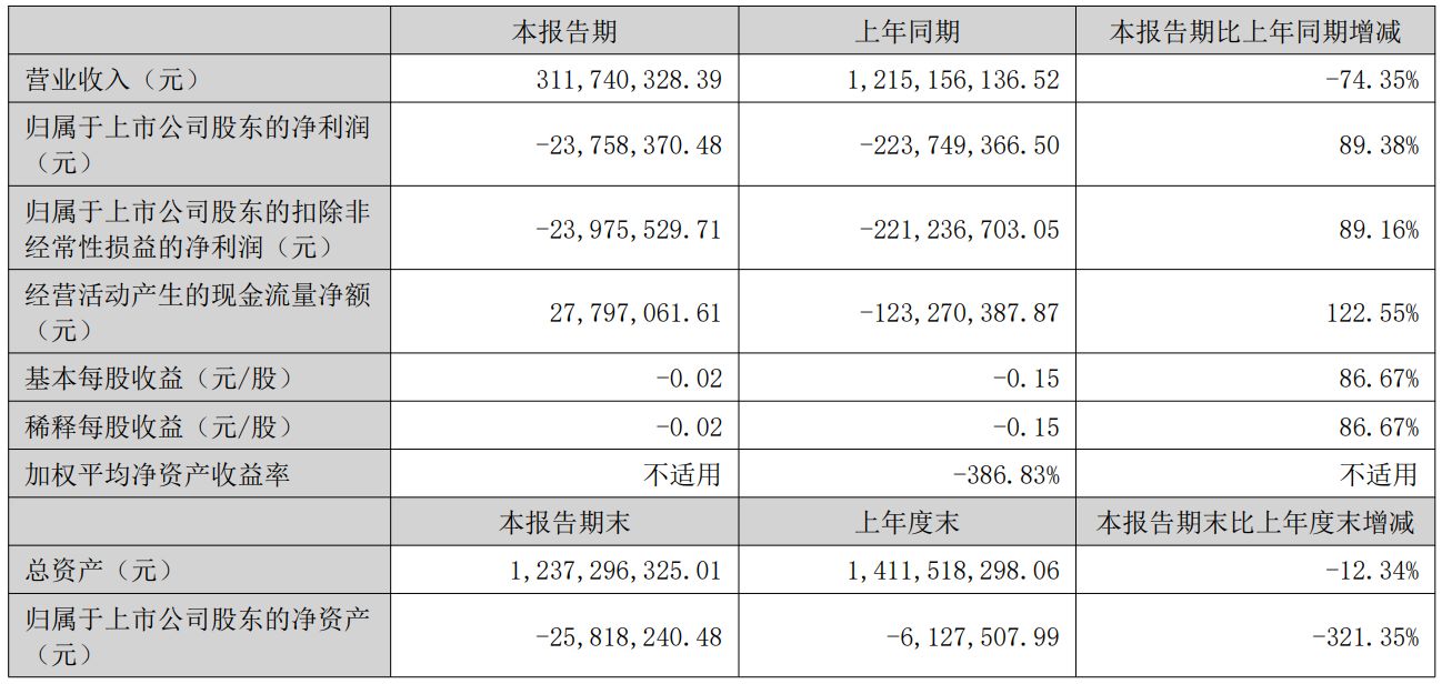 进入2025年,尽管亏损幅度大幅减小,但颓势未能彻底扭转。2025年半年度报告显示,*ST宝鹰上半年实现营业收入约3.12亿元,同比大幅下降74.35%;归属于上市公司股东的净利润为-2375.84万元。