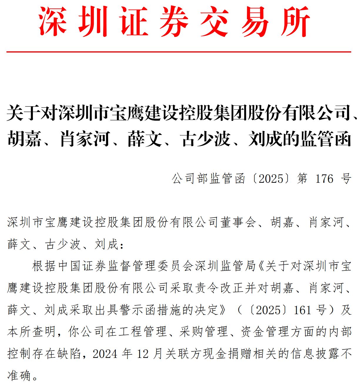 就在停牌公告发布前两日,*ST宝鹰及相关责任人刚刚收到深圳证监局的行政监管措施决定书。深圳证监局指出,*ST宝鹰在工程管理、采购管理、资金管理方面的内部控制存在缺陷,且2024年12月关联方现金捐赠相关的信息披露不准确。