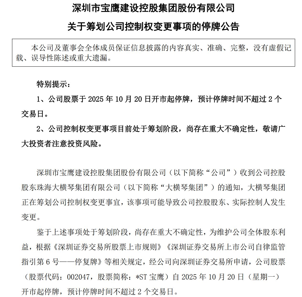 根据*ST宝鹰10月20日发布的《关于筹划公司控制权变更事项的停牌公告》,公司于当日收到控股股东大横琴集团的通知,后者正在筹划涉及公司的控制权变更事宜。公告明确指出,该事项可能导致公司控股股东、实际控制人发生变更。