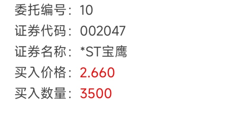$*ST宝鹰(SZ002047)$ 只剩不到1万了,挂个隔夜单碰碰运气,希望明天涨停!