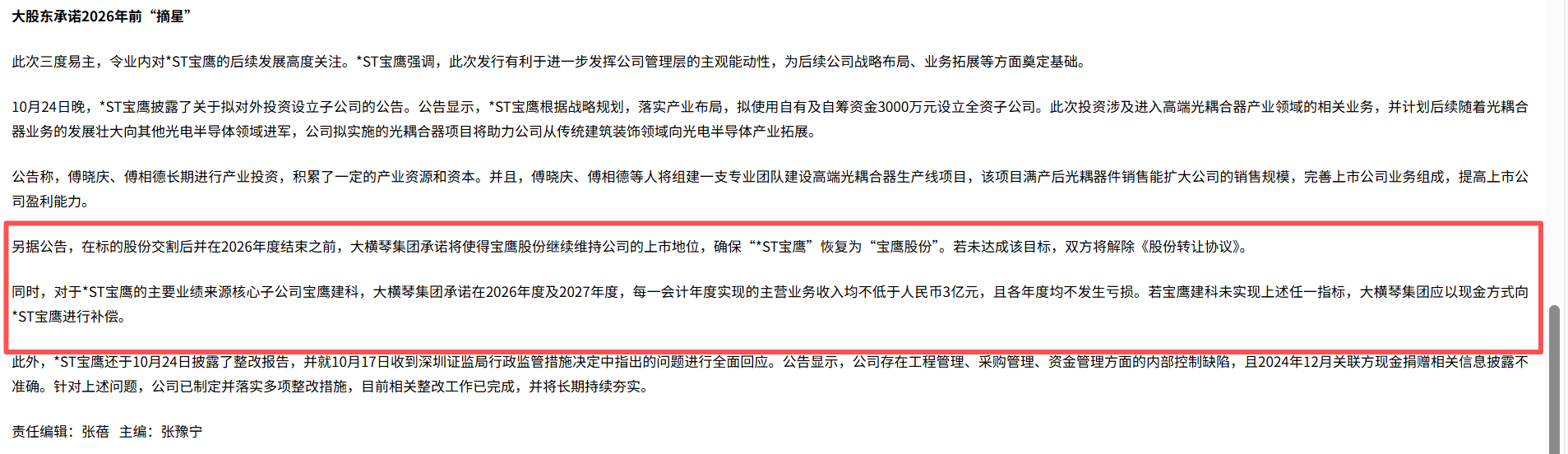 不仅“摘星”,还承诺宝鹰建科业绩,老股东负责稳健,新股东负责转型,这安排妙!