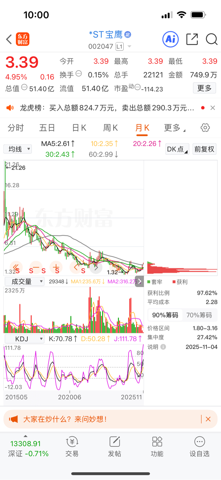 $*ST宝鹰(SZ002047)$ 冲破10年下降趋势,加油吧。