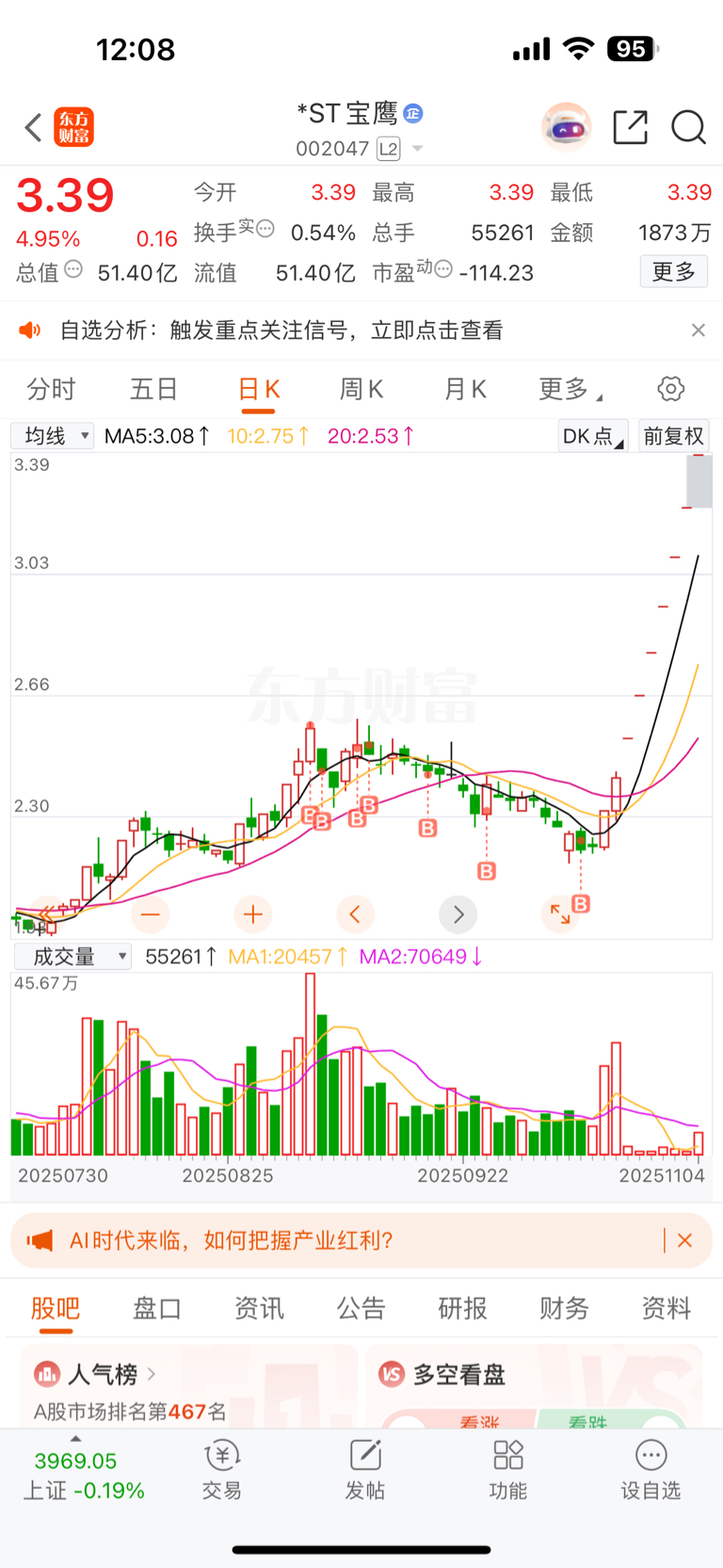 $*ST宝鹰(SZ002047)$ 那些说我唱空的,来看看,说实话我自己在车上,一直没走,现在这个价是前面很多被套牢的,很舒服的出货位置,就看这个主力是继续拉还是换一个了,前面下跌一个月主力吸了很多筹码