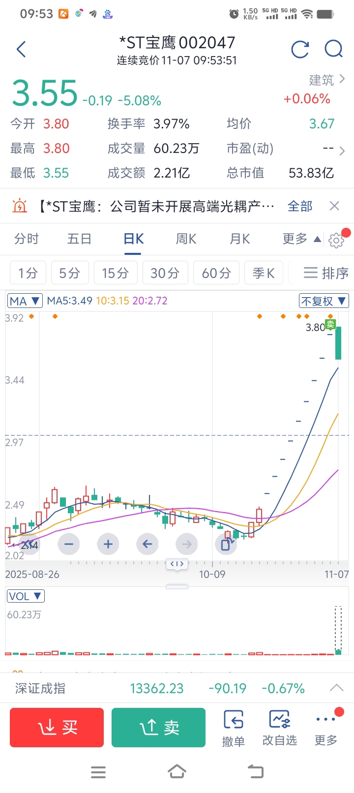 $*ST宝鹰(SZ002047)$ 天天喊开板今天开了 有人进没?让你们看看什么是精准逃顶吧