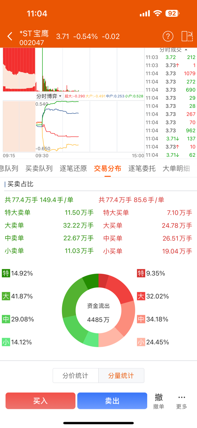 $*ST宝鹰(SZ002047)$ 还是跟昨天一样,大单一直在出货,