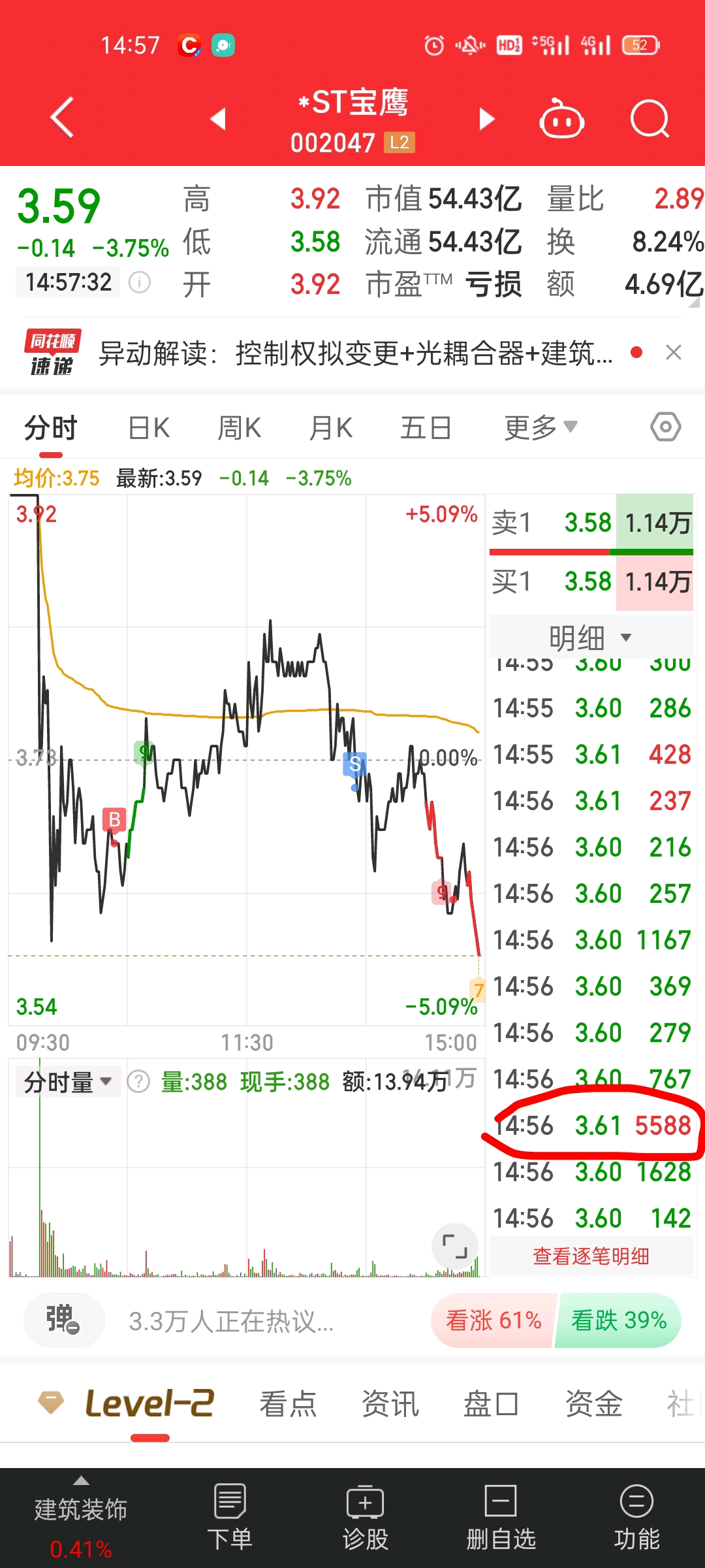 $*ST宝鹰(SZ002047)$ 好好的一字板没了,盘中还时不时出现迷惑单,你以为是买单,其实一分解开来是大卖单