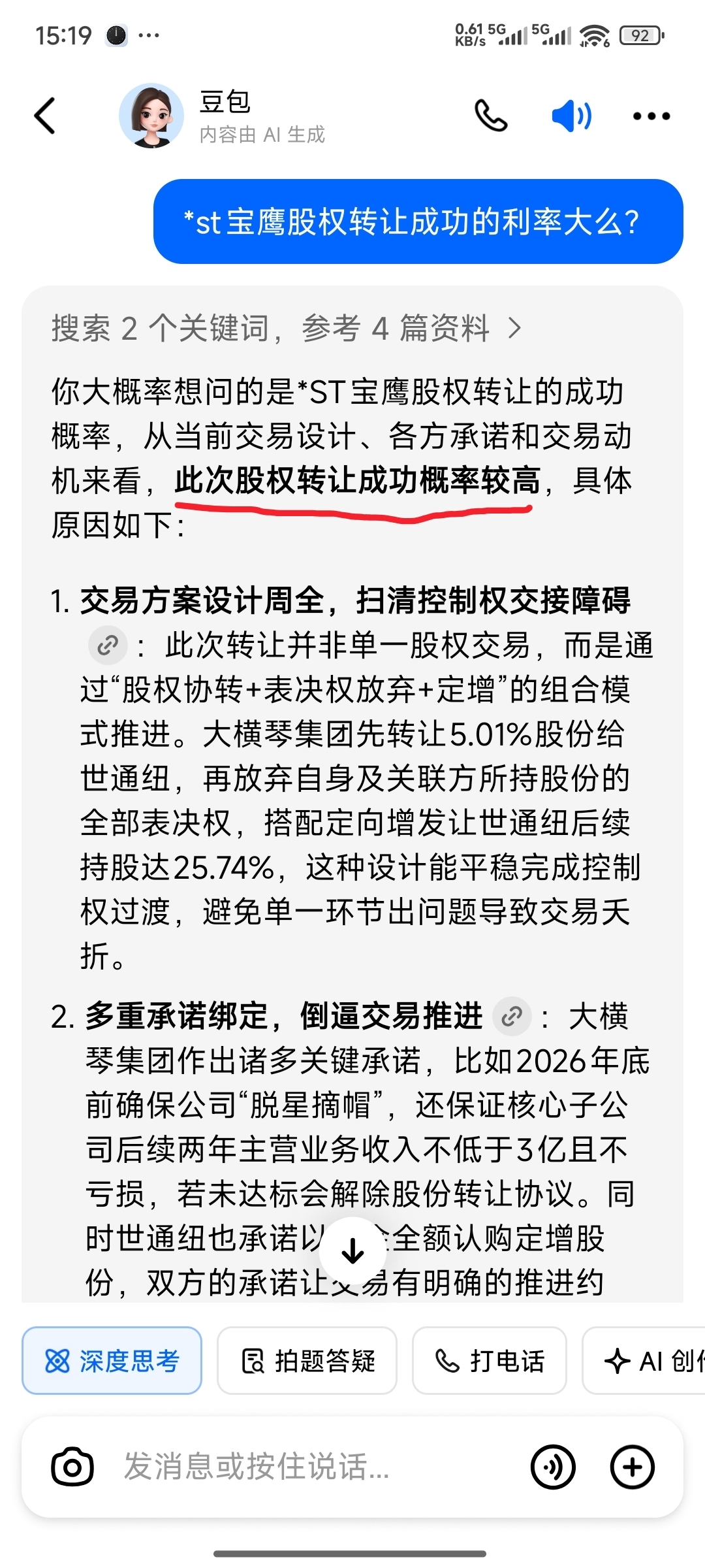 $*ST宝鹰(SZ002047)$ 股权转让成功概率还是很大的,明天低开的话,我来接盘