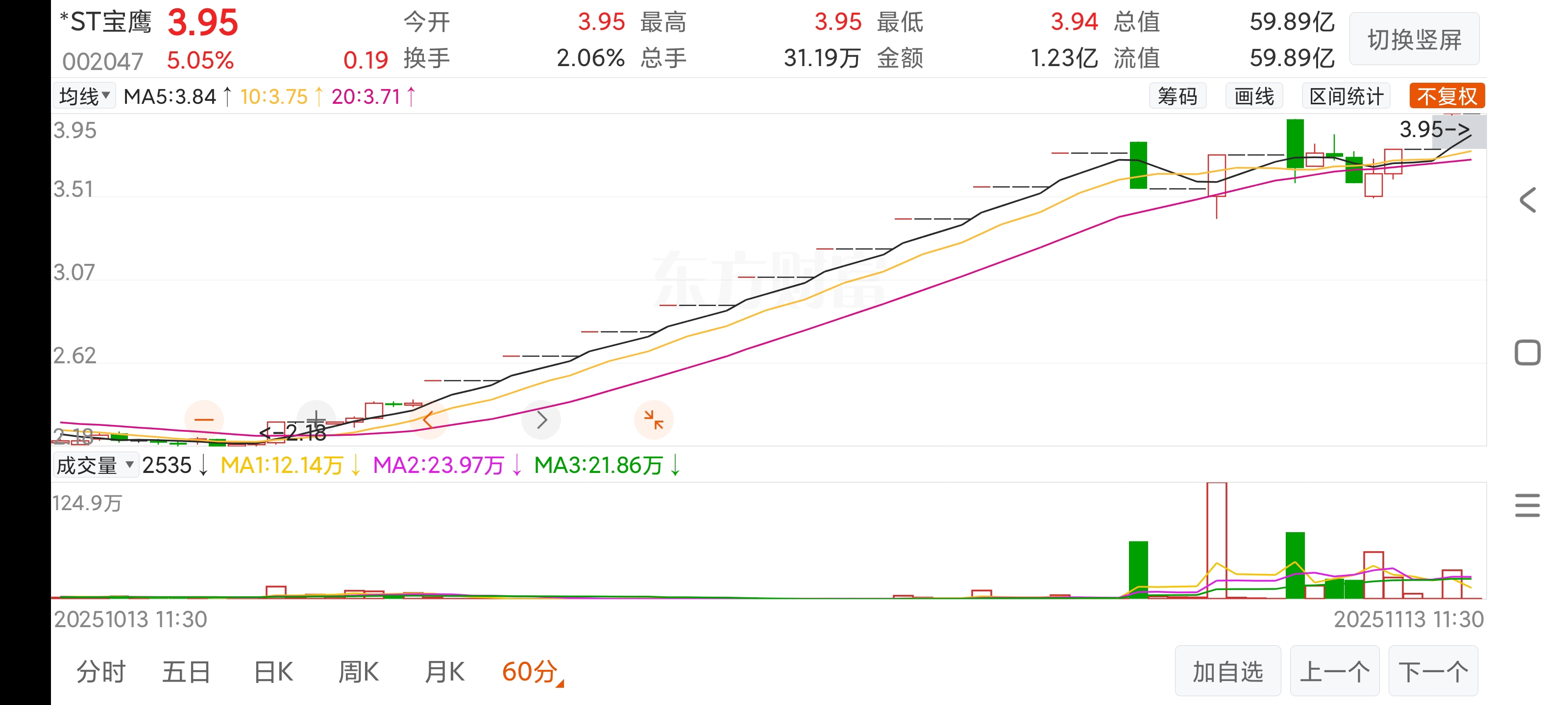 $*ST宝鹰(SZ002047)$ 一字板后的跌停,次日涨停,再前天涨停开盘收盘打到负4,昨天再拉涨停,已把底部获利筹码清洗干净了,二浪开启。