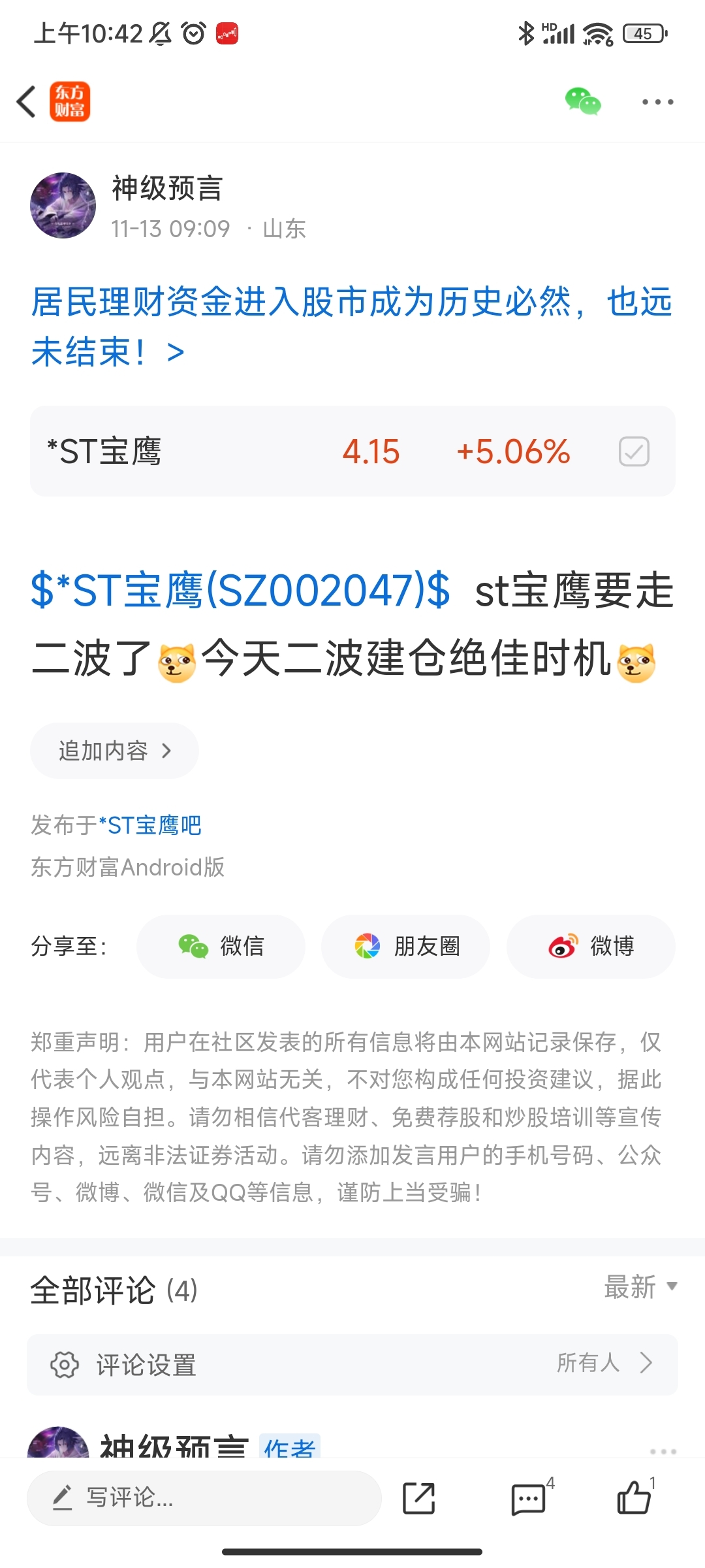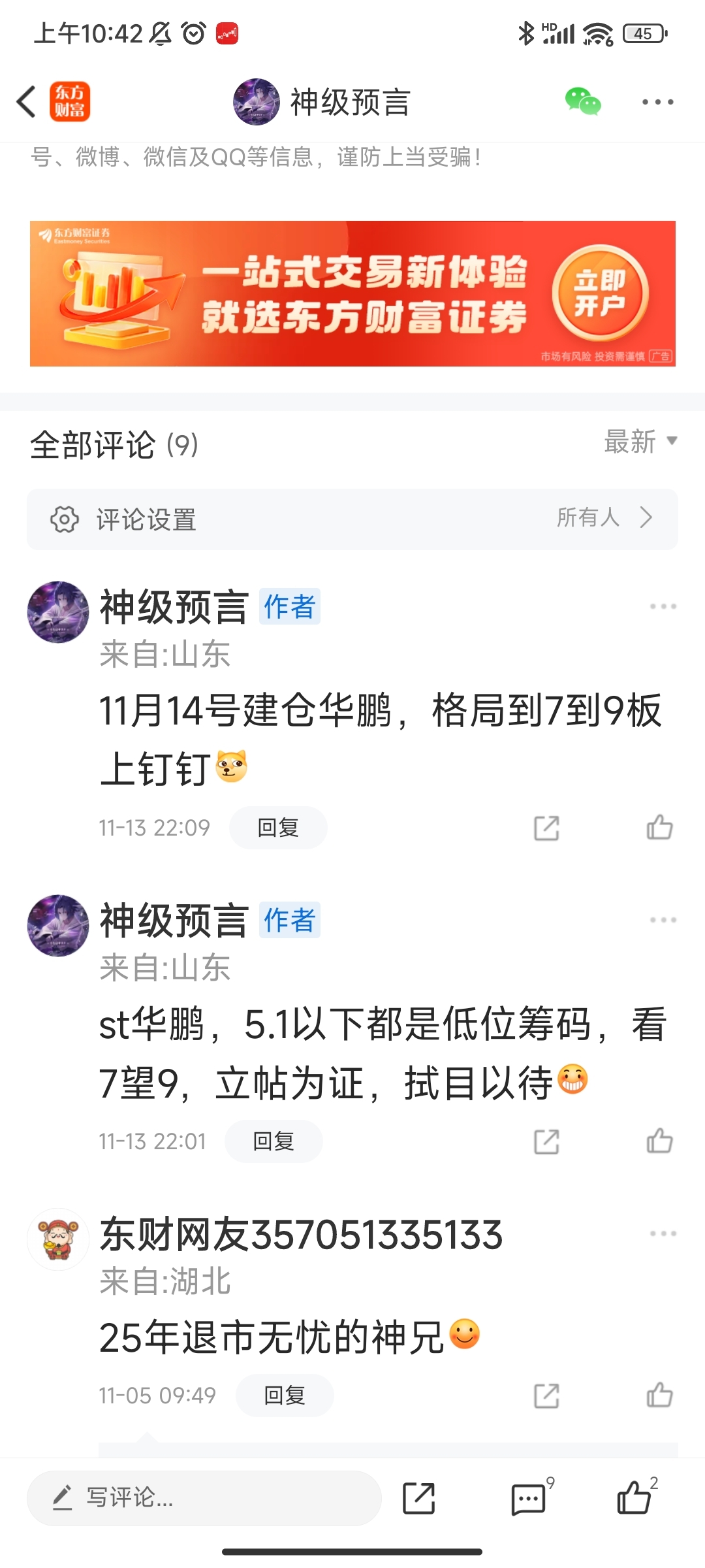 $*ST宝鹰(SZ002047)$  13号让建仓宝鹰,14号让建仓华鹏,后面的走势会证明这两个买点都是提前埋伏事先预判非常精准的操作