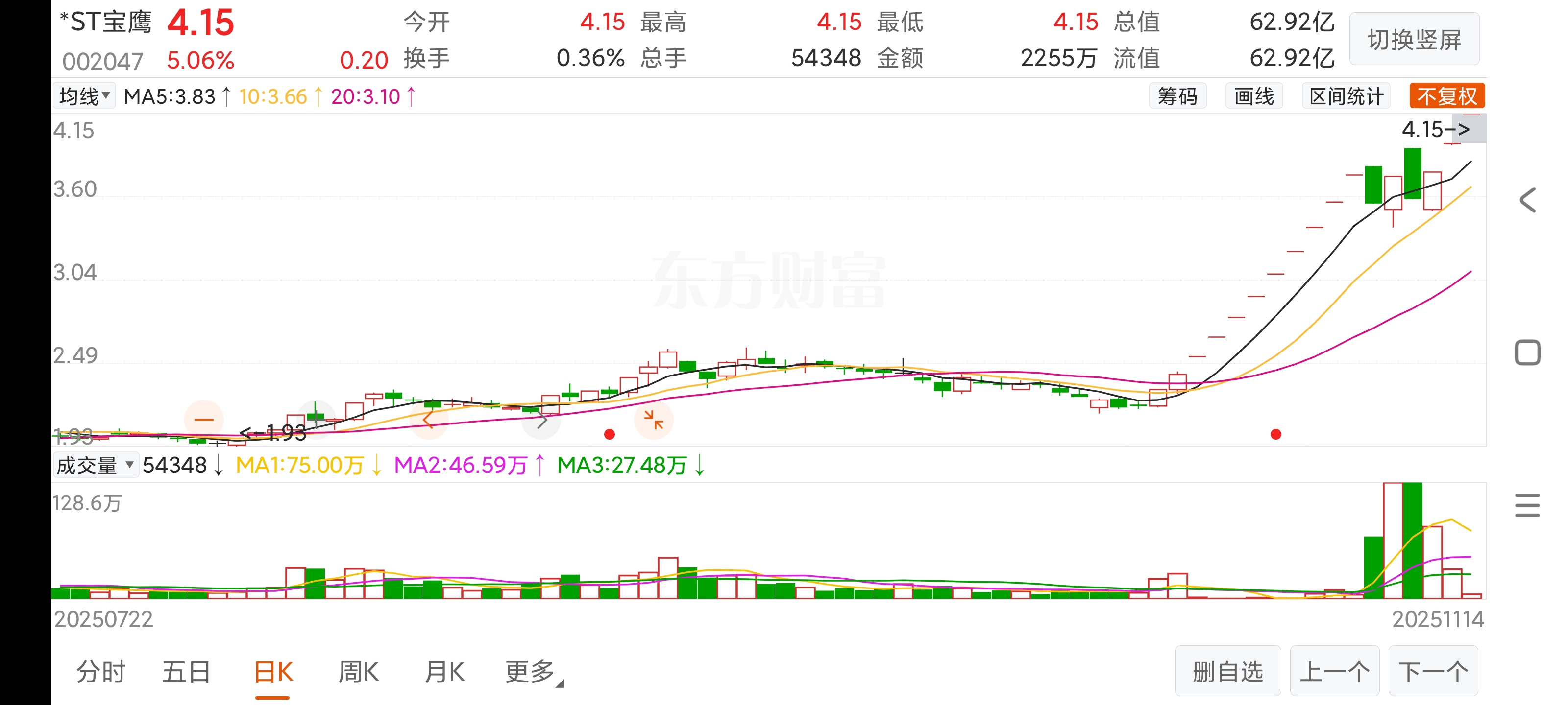 $*ST宝鹰(SZ002047)$ 宝鹰第二浪的高度考虑第一浪的涨幅,第二浪后面开板了我也不走,最多就是做T,极大可能振荡两到三天再走出第三浪上升。