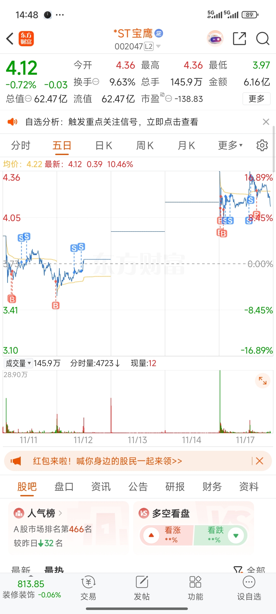 $*ST宝鹰(SZ002047)$ 看看今天的分时是不是跟上周二的一模一样!