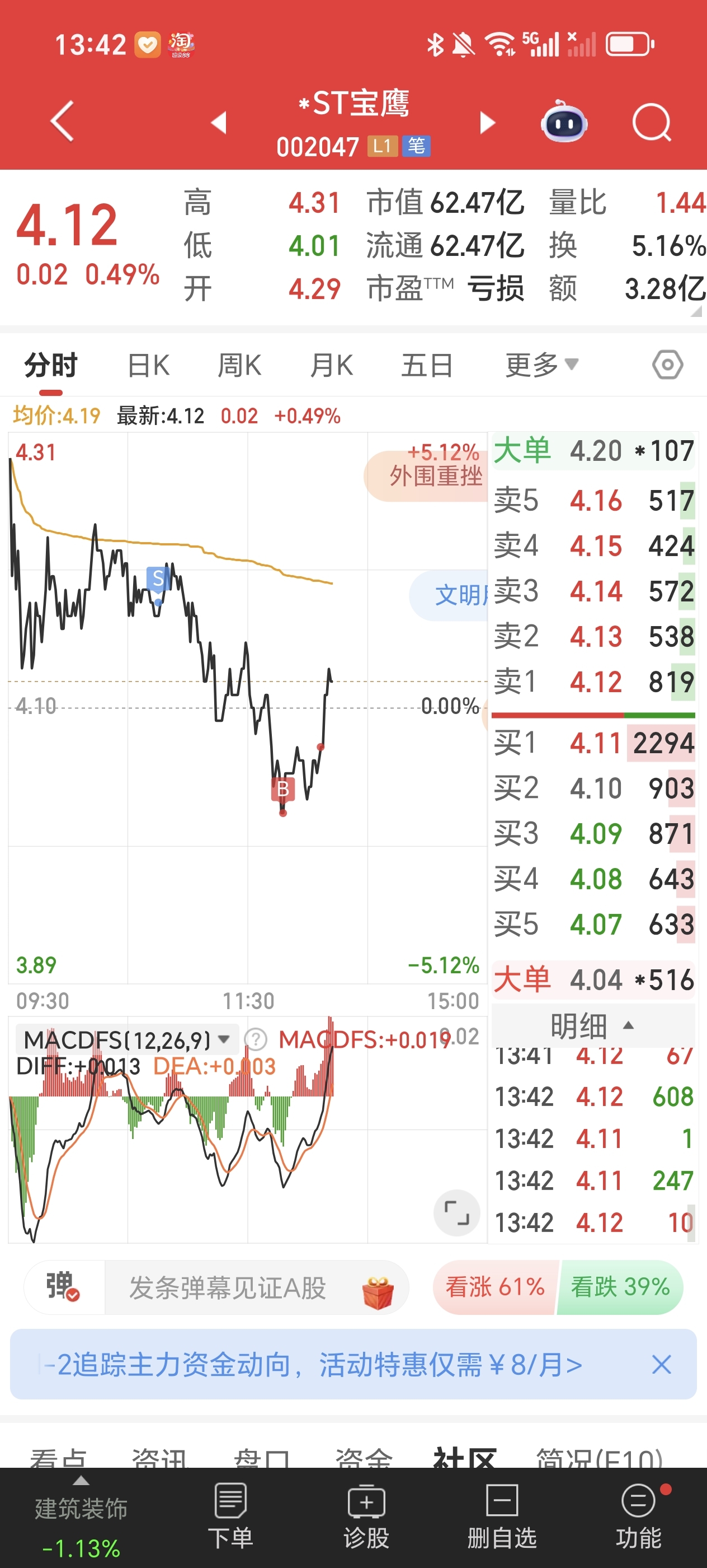$*ST宝鹰(SZ002047)$ 刚刚40%全部买回来了,点火了79万