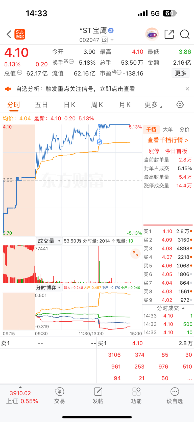 $*ST宝鹰(SZ002047)$ 明天低开再来,今天肯定会开板的
