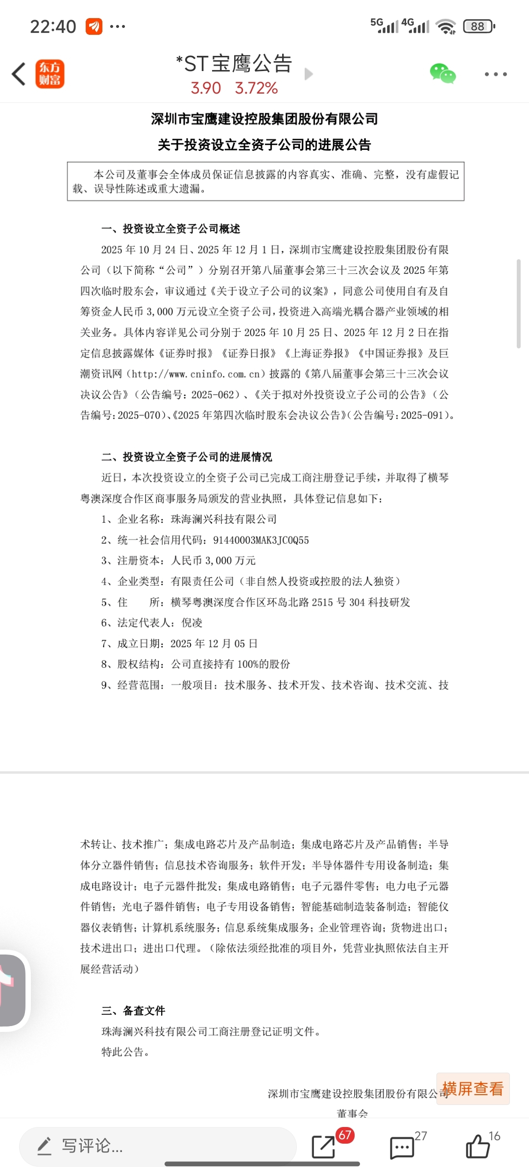 $*ST宝鹰(SZ002047)$ 公告有料,经营范围覆盖面很广!!!业务转型开始了