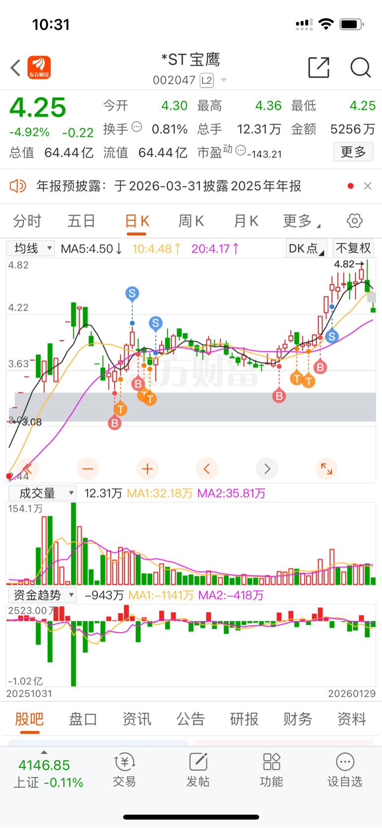 $*ST宝鹰(SZ002047)$ 感谢大哥不杀之恩,3.9再来接我,谢谢