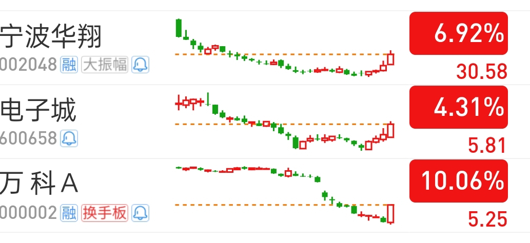 $宁波华翔(SZ002048)$ $电子城(SH600658)$ $万 科A(SZ000002)$ 今天地产,汽车里机器选了3个,喜欢的自己点菜。商业连锁也挺火,不过涨4天了不太敢选,下手太晚了