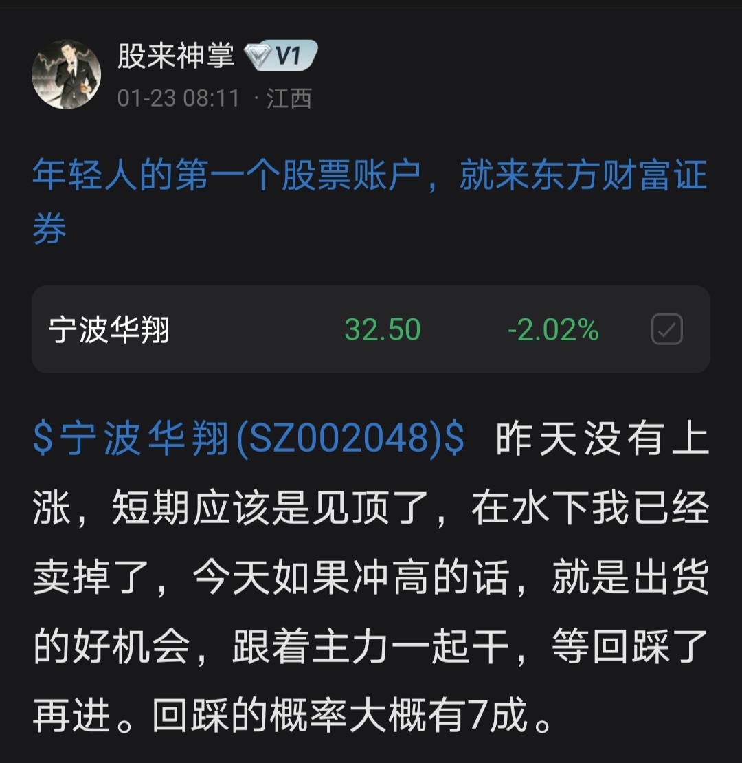 23日,早上劝大家直接开盘就走!28日,分析出宁波华翔技术面已经具备反弹!昨天大盘太差,我在低点接了货,尾盘再加!技术面支持+配合消息面,反弹如期而至!大家一定要冷静分析再做判断,不能意气用事!