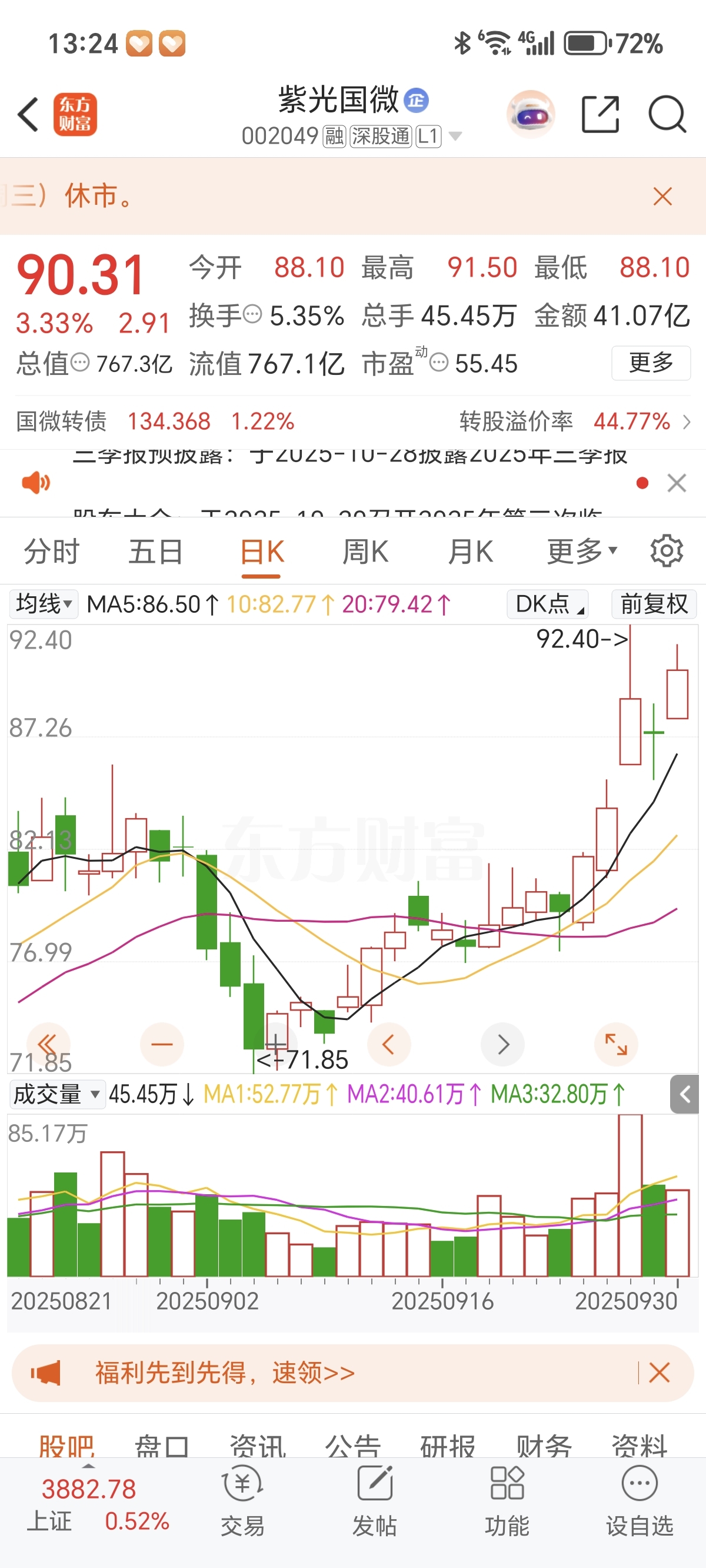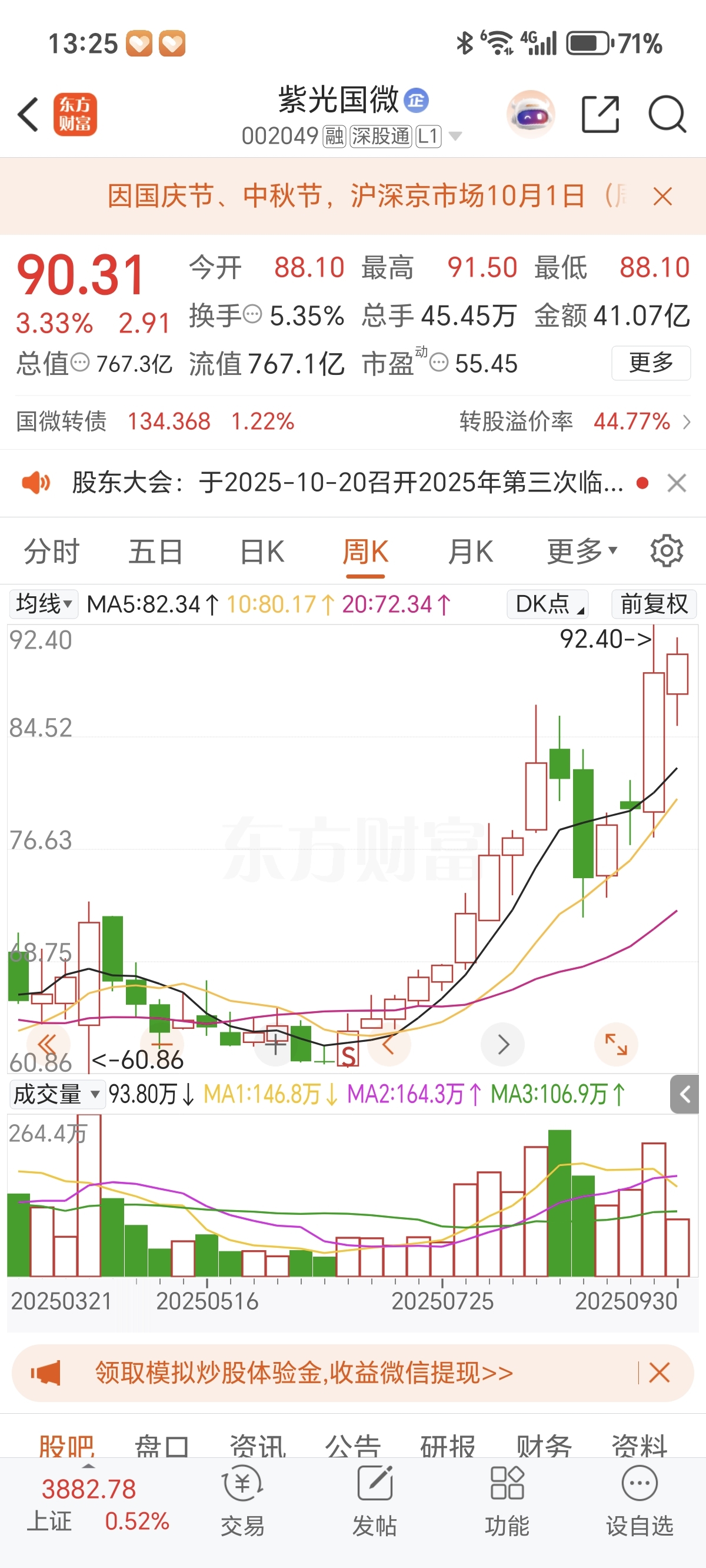 紫光国微的日线周线月线的技术图形,从哪里看十月份都是走强的概率极大,就看三季报和