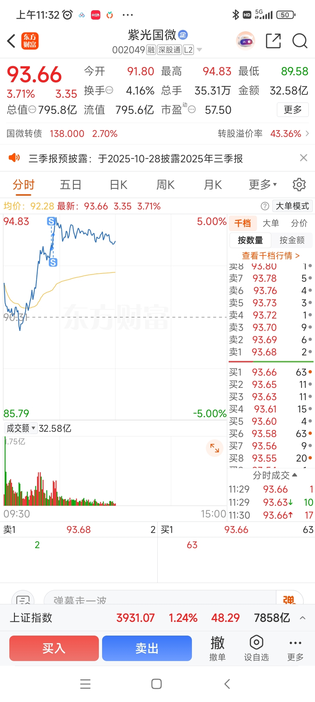 $紫光国微(SZ002049)$ 板块热到极点,高处不胜寒,虽然国微弱势了点,好歹也涨了不少,慢慢落袋为安了哈,谢谢国微。