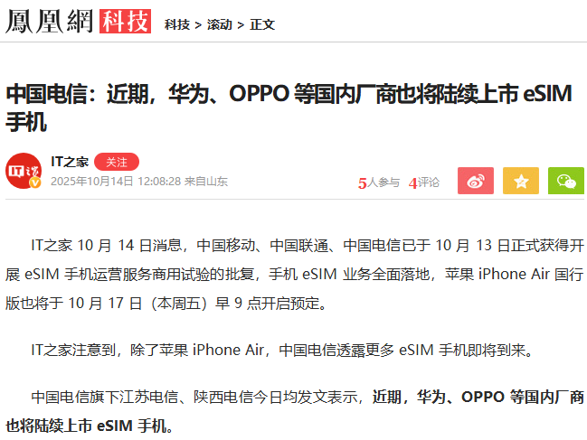 中国电信:近期,华为、OPPO 等国内厂商也将陆续上市 eSIM 手机