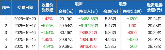 融资方面,当日融资买入1.87亿元,融资偿还2.22亿元,融资净偿还3468.35万元。融券方面,融券卖出8300股,融券偿还9500股,融券余量5.35万股,融券余额431.21万元。融资融券余额合计29.24亿元。
