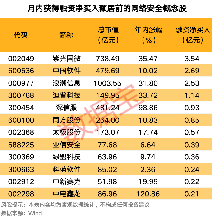 从资金面来看,截至10月28日,19只概念股月内获得融资净买入,紫光国微、中国软件、浪潮信息、迪普科技的融资净买入额居前,均超1亿元。