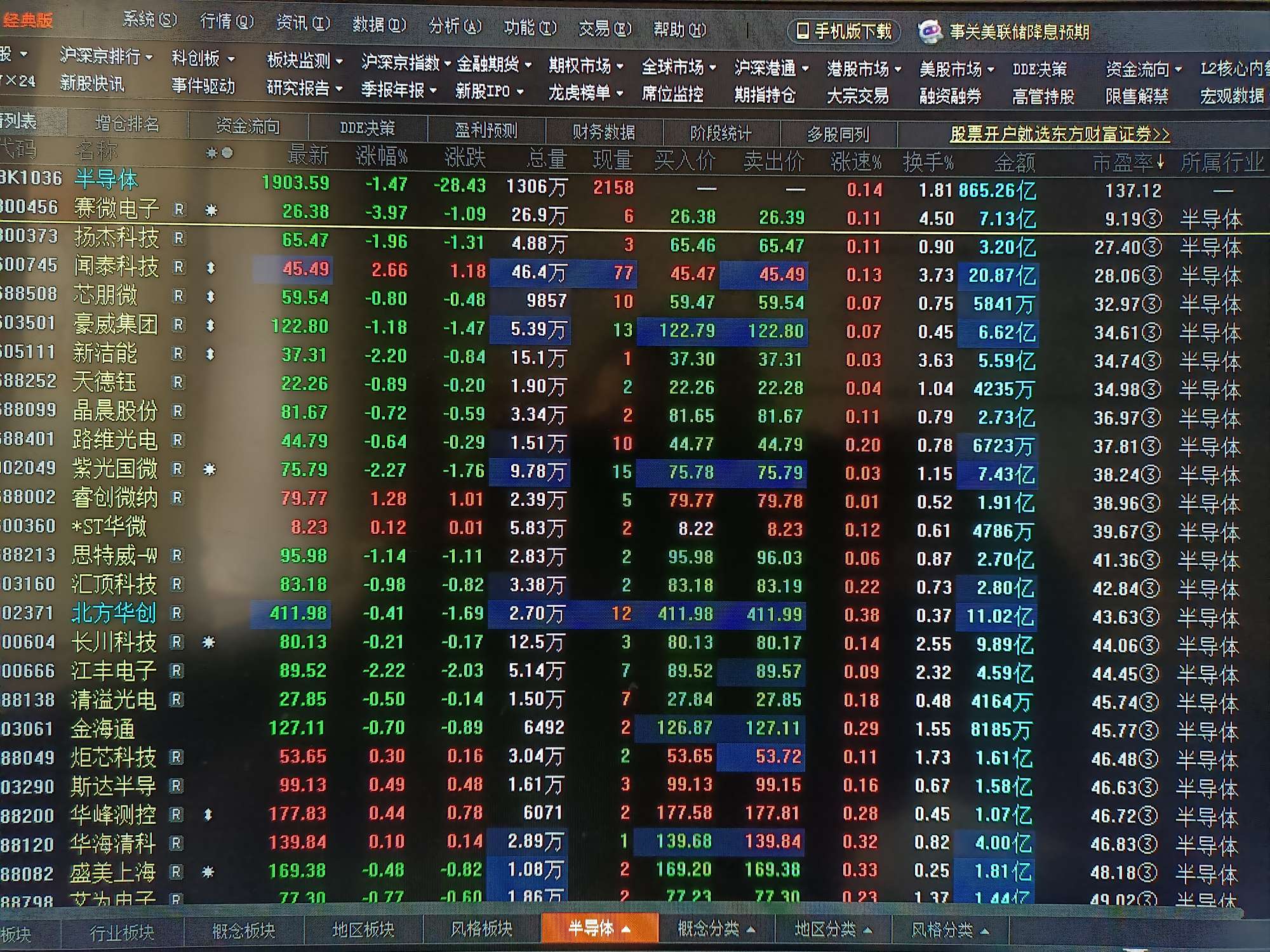 半导体板块168只股票市盈率排名前20的股票紫光国微第十位