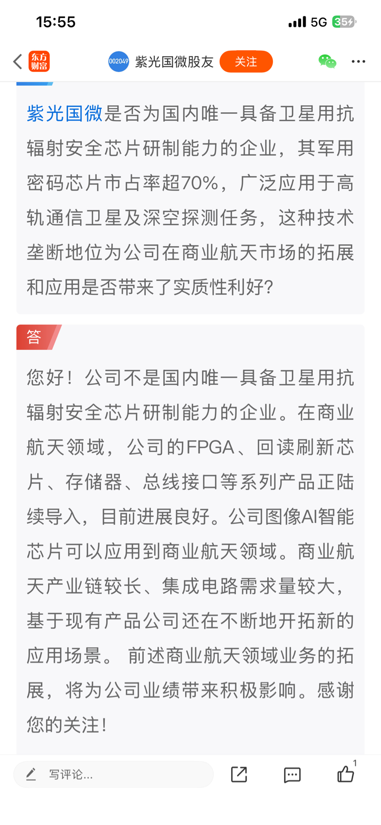 $紫光国微(SZ002049)$ 你这个商业航天怎么一点动静也没有。没有反应在股价上