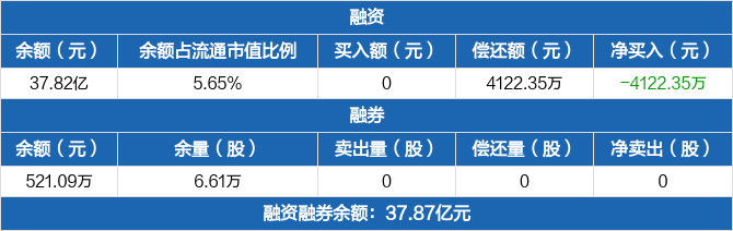 融资方面,当日融资买入0元,融资偿还4122.35万元,融资净偿还4122.35万元,连续4日净偿还累计2.13亿元。融券方面,融券卖出0股,融券偿还0股,融券余量6.61万股,融券余额521.09万元。融资融券余额合计37.87亿元。