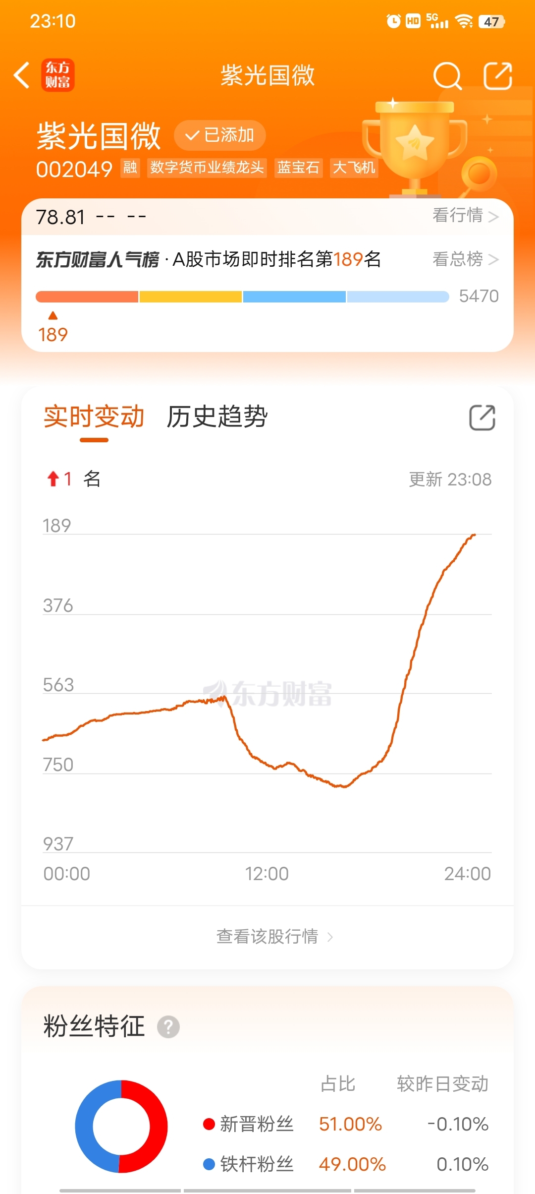 $紫光国微(SZ002049)$ 人气直线上升,到明天开盘要进入前50了