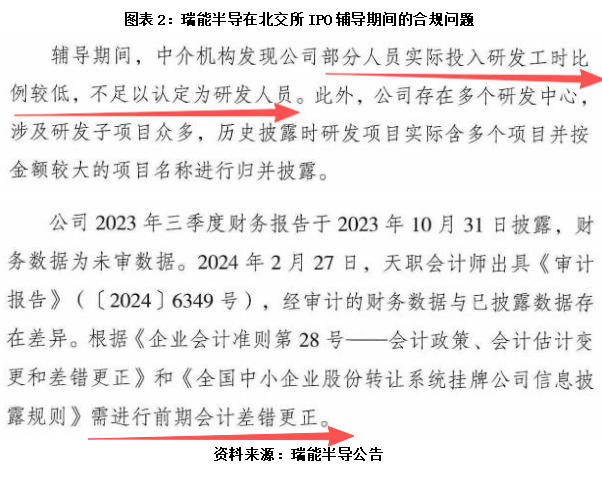 值得一提的是,在北交所IPO辅导推进过程中,瑞能半导还被曝出多项合规问题,涵盖“部分人员实际投入研发工时比例较低,不足以认定为研发人员”“会计差错更正”等情形。