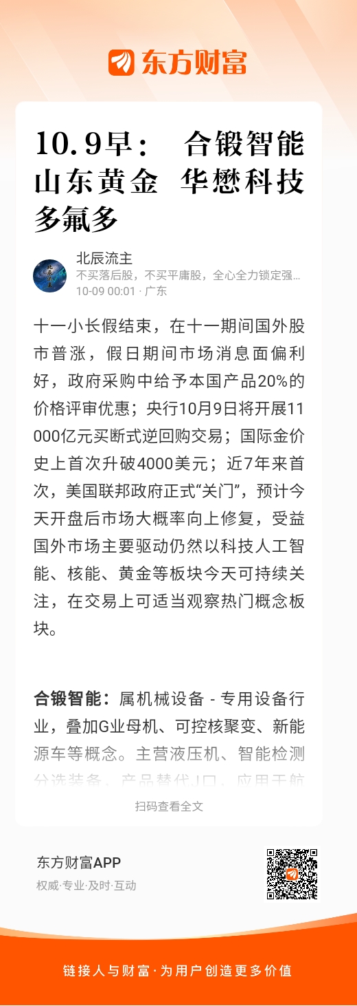十一小长假结束,在十一期间国外股市普涨,假日期间市场消息面偏利好,政府采购中给予本国产品20%的价格评审优惠;央行10月9日将开展11000亿元买断式逆回购交易;国际金价史上首次升破4000美元;近7年来首次,美国联邦政府正式“关门”,预计今天开盘后市场大概率向上修复,受益国外市场主要驱动仍然以科技人工智能、核能、黄金等板块今天可持续关注,在交易上可适当观察热门概念板块。