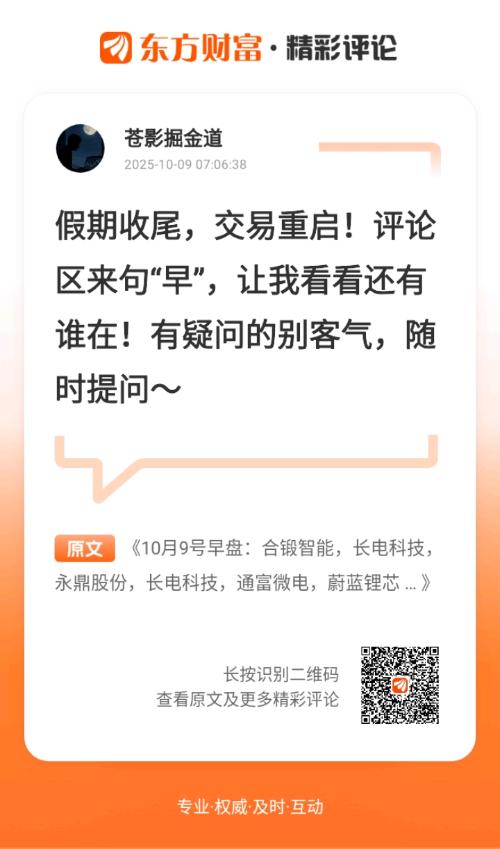 //@苍影掘金道 :假期收尾,交易重启!评论区来句“早”,让我看看还有谁在!有疑问的别客气,随时提问~ $三花智控(SZ002050)$$合锻智能(SH603011)$$上海电气(SH601727)$