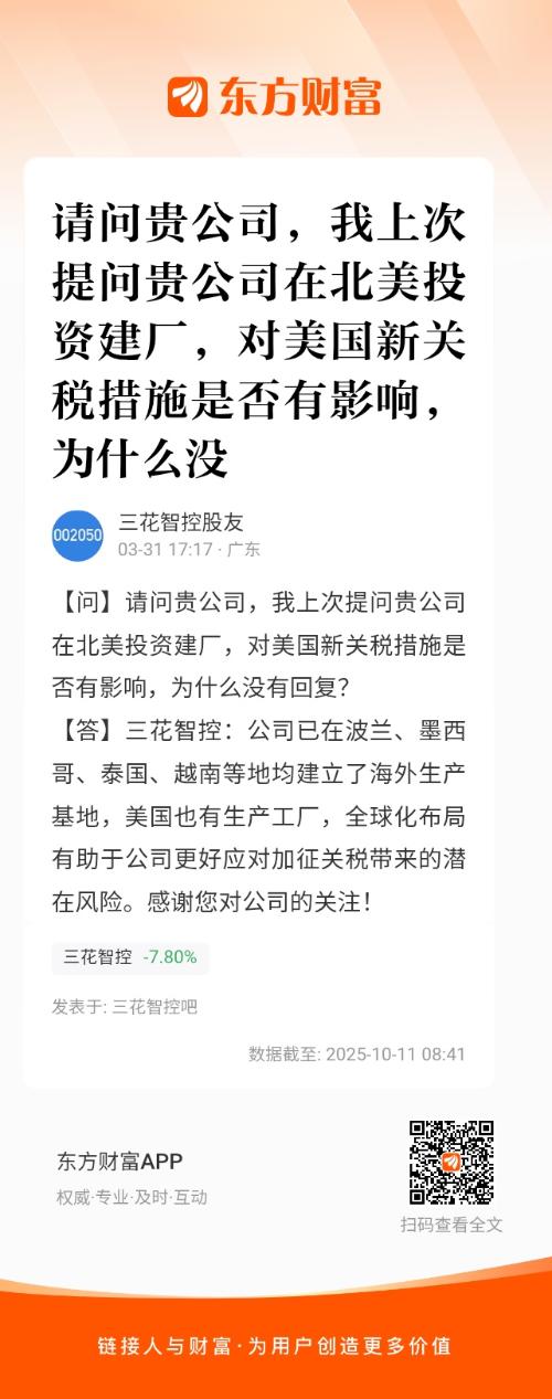 请问贵公司,我上次提问贵公司在北美投资建厂,对美国新关税措施是否有影响,为什么没有回复?