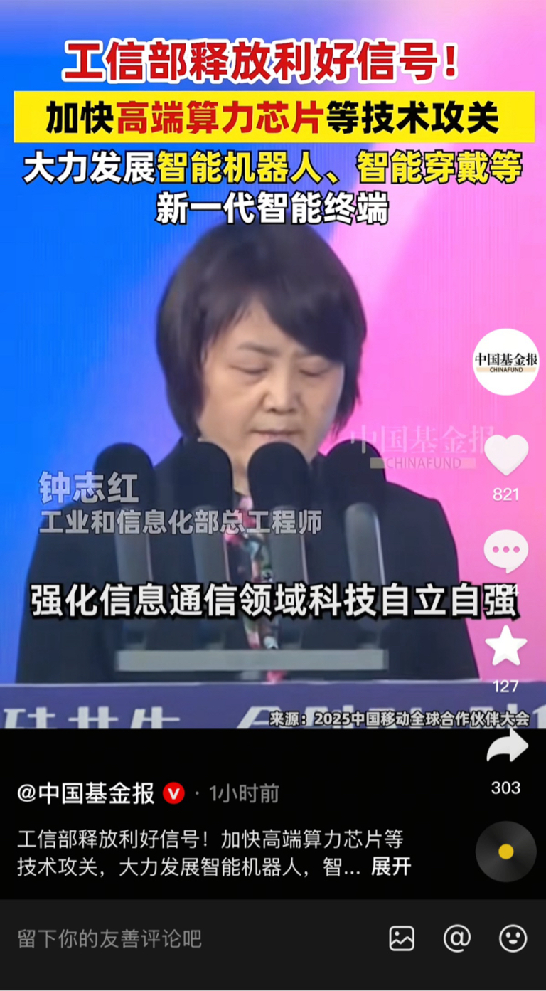 工信部释放利好信号,加快高端算力芯片等技术攻关,大力发展智能机器人,智能穿戴等新