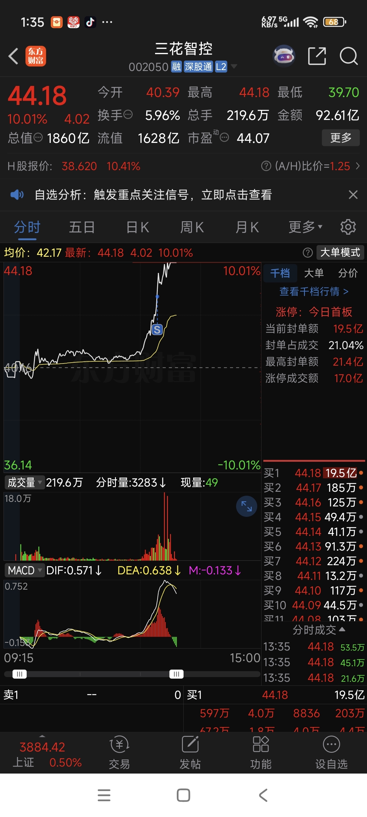 唉呀!我滴个神啊!我挂的42.88元的亏起点卖的卖单,你到好,涨停了!恭喜恭喜持