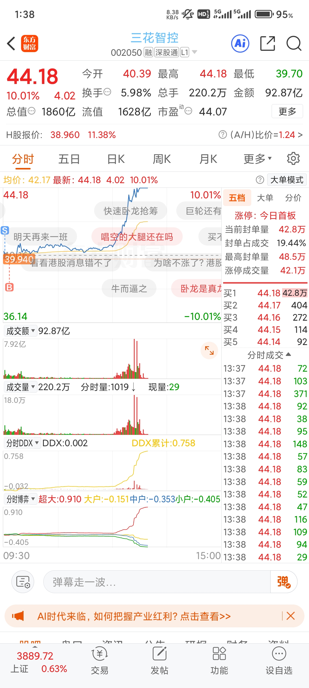$三花智控(SZ002050)$ 虽然吃了个涨停,但是一点也不开心。本来预计一边T一边加重仓位的,现在才拿不到15%的
