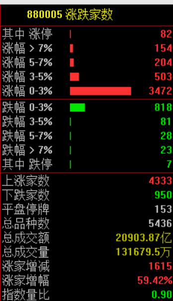 市场共4333只个股上涨,82只个股涨停,950只个股下跌。