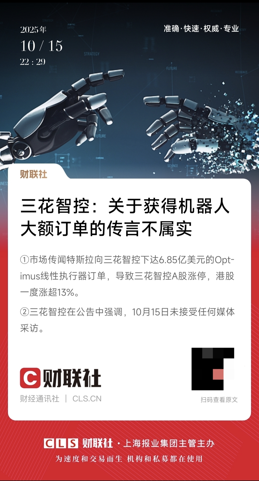 $三花智控(SZ002050)$ 辟谣了,关于三花智控获得机器人大额订单的传言不属实。本来日线就还没走好,市场被假消息玩得团团转。